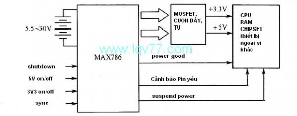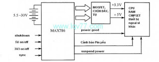 Max786 là IC điều khiển nguồn cho máy tính xách tay. Nhiệm vụ chính của IC là tạo xung và điều chỉnh xung để kết hợp với Cặp Mosfet, cuộn dây, tụ lọc bên ngoài tạo nguồn 3V3 và 5V như cách mà mạch VRM tạo ra Vcore ở Mainboard máy để bàn.