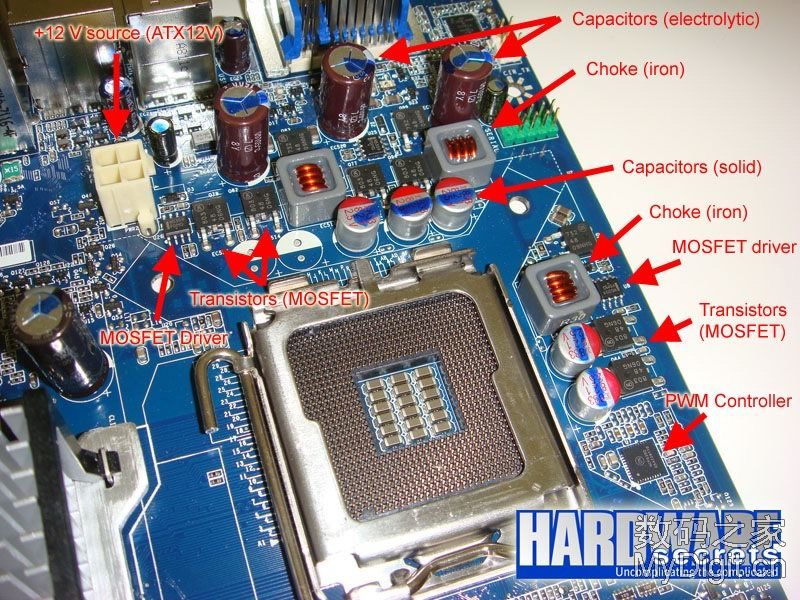 power supply module, as mentioned above, 1 inductance (can be composed of two materials, iron core or ferrite), 2. transistor, 3. capacitor ( good motherboard will provide durability Of aluminum electrolytic capacitors ) . Transistor circuit power supply module called MOSFET ( Metal Oxide Semiconductor Field Effect Transistor ) technology produced , known simply as ” the MOSFET .” Some motherboards use passive cooling – a heat sink to cool the “ MOSFET ”. There is another very important component called ” PWM ” controller, and the same well-designed and small “MOSFET driver”.