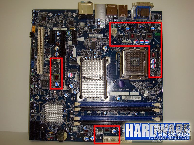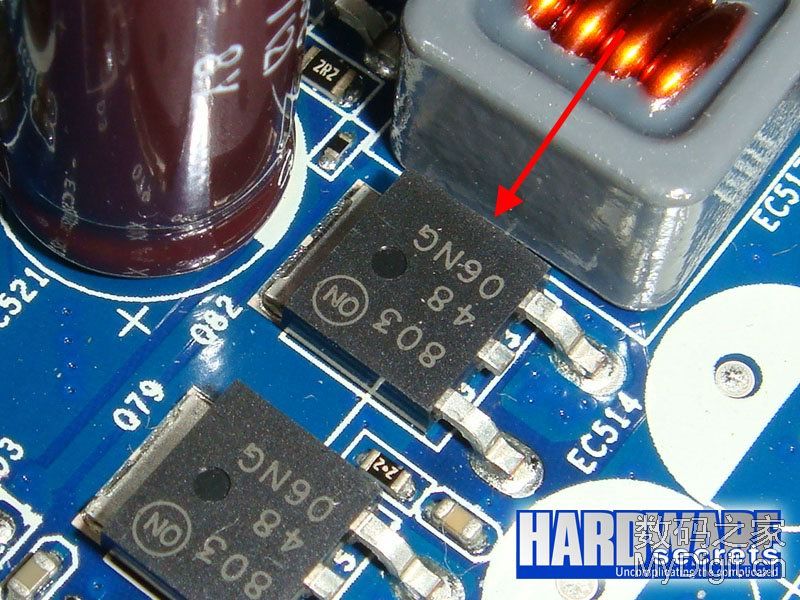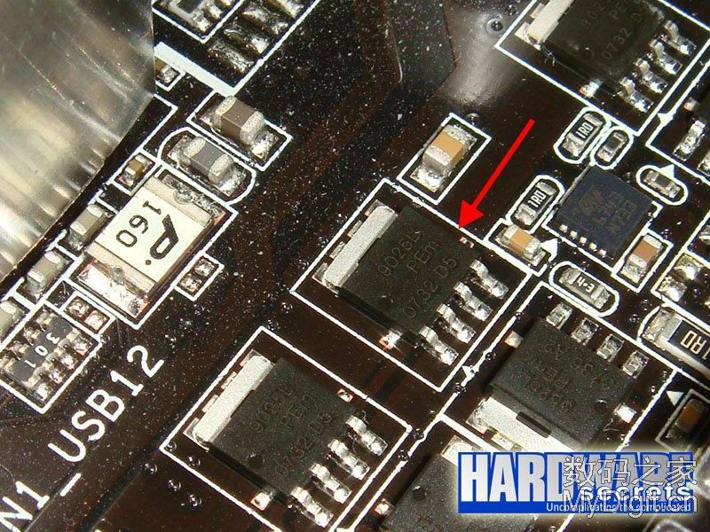 Although all motherboard power supply modules useMOSFETs, there are good and bad. Good MOSFET of the switch resistance is low –this parameter is called “the DPS“, less heat( relative to conventional MOSFET least 16% of the heat, but also said Gigabyte ), a volume smaller than a conventionalMOSFET. There is a simple way to distinguish the two. The traditional MOSFET has three pins . The center pin is usually low-break and floating. The low-impedance MOSFET has four or more pins and are all soldered to the motherboard . You can see the difference betweenFigure7and Figure8.