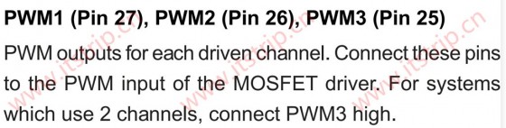Each drivePWMOutput channels.These pins are connected toMOSFETDrivePWMInput. The system uses2Channels, connectingPWM3High.