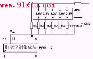 I do not need to discuss switching regulator works, I just want to first of all tell us about the voltage regulator part of the core voltage and VIO voltage generally use a single jumper (One Jumper) design, that is, hopping through the cap with a short jumper from one group of the different location, connected to different sub-pressure resistance, see the diagram below, from the PWM section 14 feet (This pin’s function is to provide 5V reference voltage) share a different reference voltage, and then with the sample from the output of the voltage comparator, and then feedback back to the internal PWM error amplifier to adjust the pulse width to achieve the purpose of regulation, it is clear that the resistance of several resistors. is to determine the output voltage level of the key factors.
