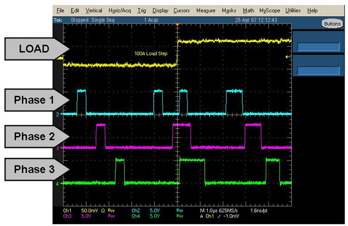 show the response of a 4-phase controller to a 100A step. (The four channel scope allowed the load current and only three phases to be shown.) The converter used in this example switches at 300 kHz per phase. The event captured in