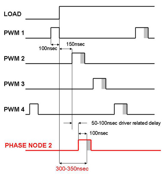signals labeled PWM1 to PWM4 are the PWM signals the controller sends to the MOSFET drivers. Suppose now that a load step increase occurs right at the moment when PWM1 signal goes down. With the above assumptions, in this conventional trailing edge topology the next PWM signal will appear on the adjacent phase after 150 nsec. The corresponding phase node will go high 50 to 100 nsec later due to the delay introduced by the MOSFET driver and MOSFET. Add to this delay another 100 nsec due to the duty cycle prior to the load increase and now it is clear that the phase will start to react to the load increase 300 to 350 nsec after its occurrence.