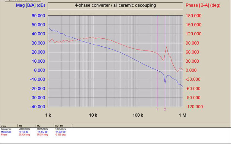 shows what can be expected in terms of loop performance from such a converter: 260 kHz cross-over and 55 degree phase margin while switching at 400 kHz is a hard to achieve set of numbers. For those rare applications where meeting cost is not the main goal, fewer and fewer fortunate engineers face limits when designing a system using dual edge modulation to achieve a 310 kHz cross-over and over 60 degree phase margin while switching at just 430 kHz. The task of debating the validity or significance of these numbers is left to the purists.